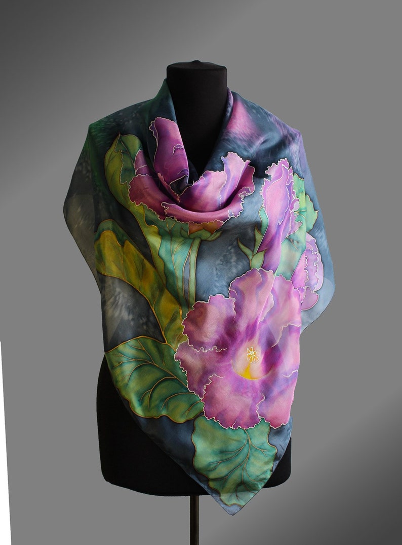Hand Painted Silk Scarf With Gloxinia Flowers Floral Scarf Etsy